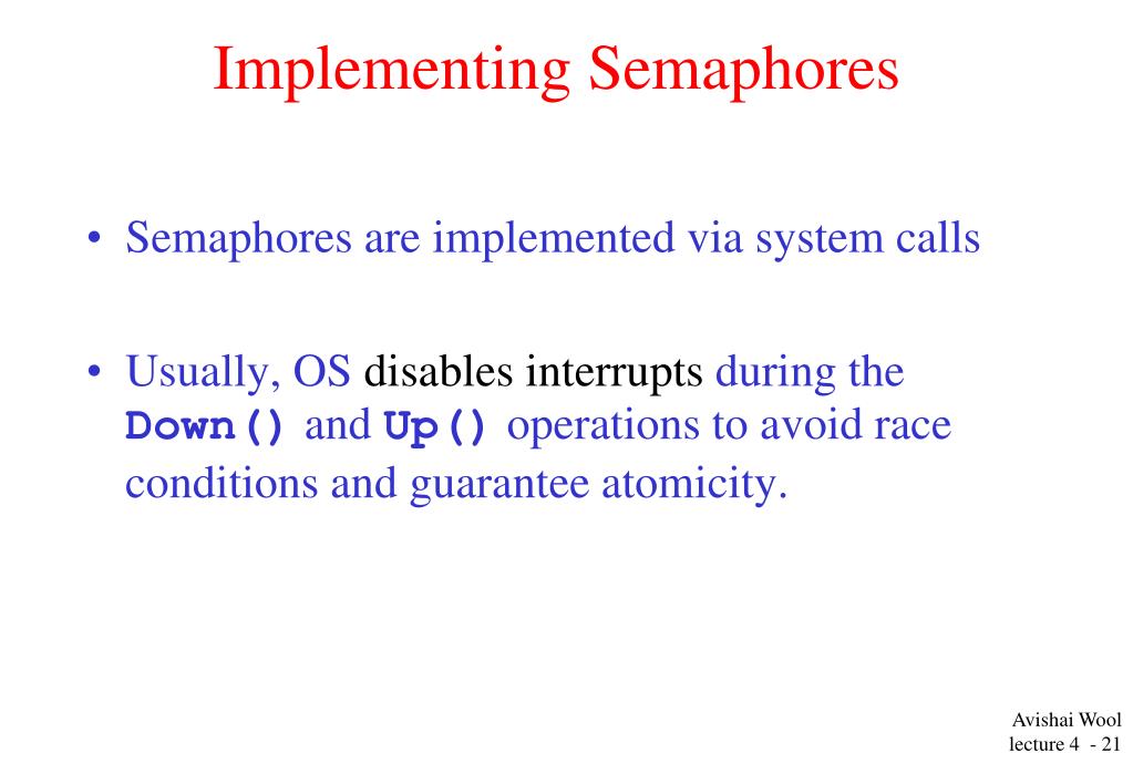 Implementing Semaphores • Semaphores are implemented via system calls • Usually, OS disables interrupts during the Down() and Up() operations to avoid race conditions and guarantee atomicity.