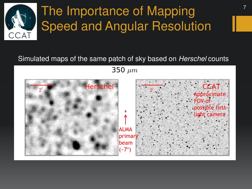 7 The Importance of Mapping Speed and Angular Resolution Simulated maps based on Herschel number counts Simulated maps of the same patch of sky based on Herschel counts Approximate FOV of possible first-light camera ALMA primary beam (~7)
