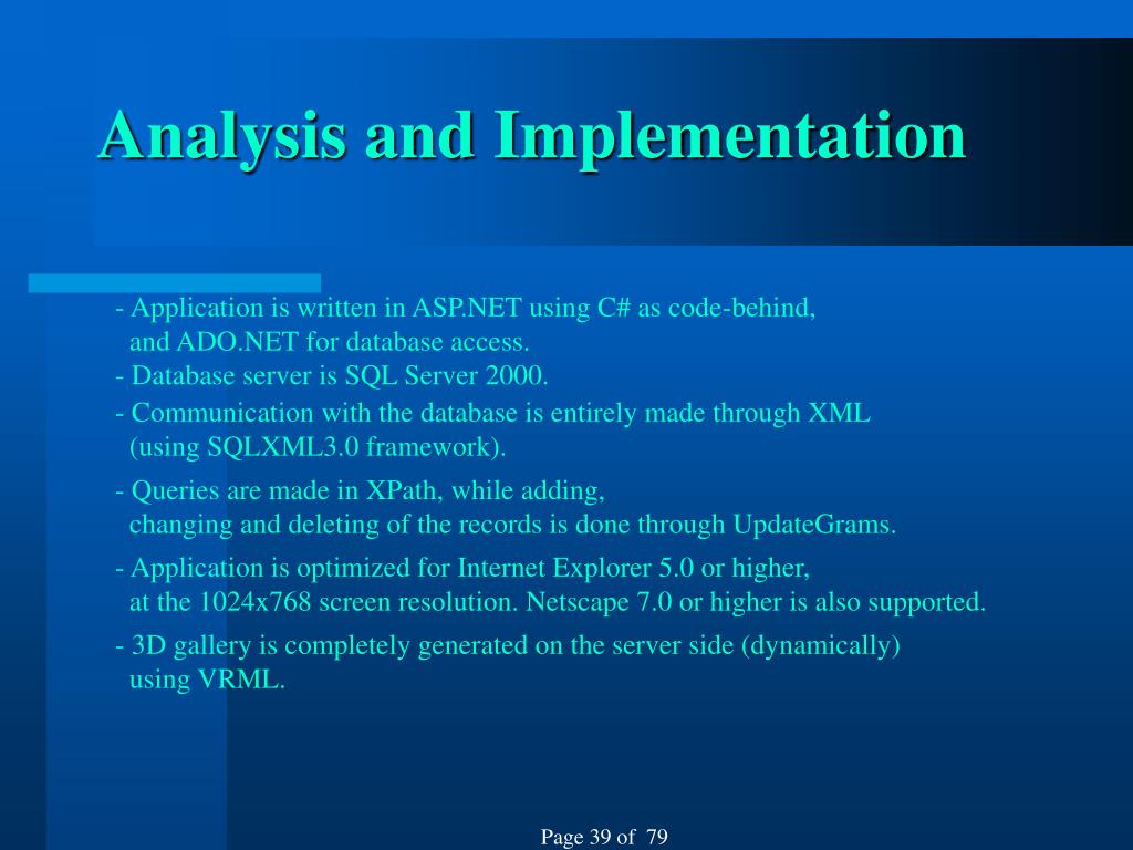 Analysis and Implementation - Application is written in ASP.NET using C# as code-behind, and ADO.NET for database access. - Database server is SQL Server 2000. • Communication with the database is entirely made through XML (using SQLXML3.0 framework). • Queries are made in XPath, while adding, changing and deleting of the records is done through UpdateGrams. - Application is optimized for Internet Explorer 5.0 or higher, at the 1024x768 screen resolution. Netscape 7.0 or higher is also supported. - 3D gallery is completely generated on the server side (dynamically) using VRML.