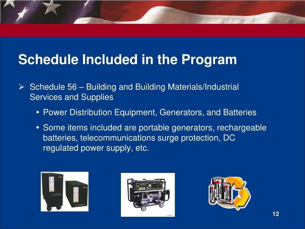 Schedule Included in the Program • Schedule 56 – Building and Building Materials/Industrial Services and Supplies • Power Distribution Equipment, Generators, and Batteries • Some items included are portable generators, rechargeable batteries, telecommunications surge protection, DC regulated power supply, etc.