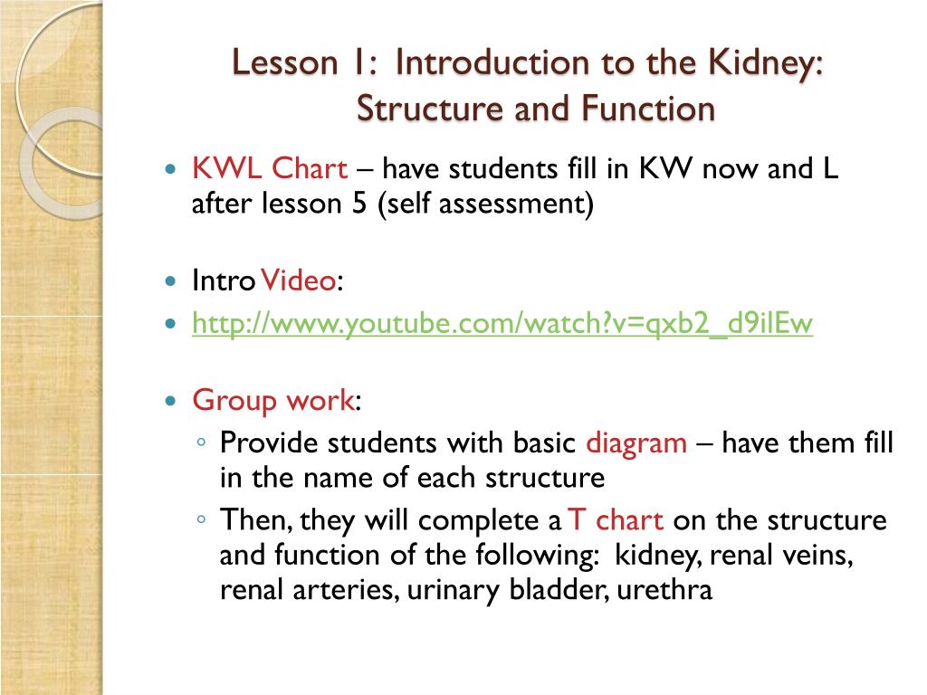 Lesson 1: Introduction to the Kidney: Structure and Function • KWL Chart – have students fill in KW now and L after lesson 5 (self assessment) • Intro Video: • http://www.youtube.com/watch?v=qxb2_d9ilEw • Group work: • Provide students with basic diagram – have them fill in the name of each structure • Then, they will complete a T chart on the structure and function of the following: kidney, renal veins, renal arteries, urinary bladder, urethra