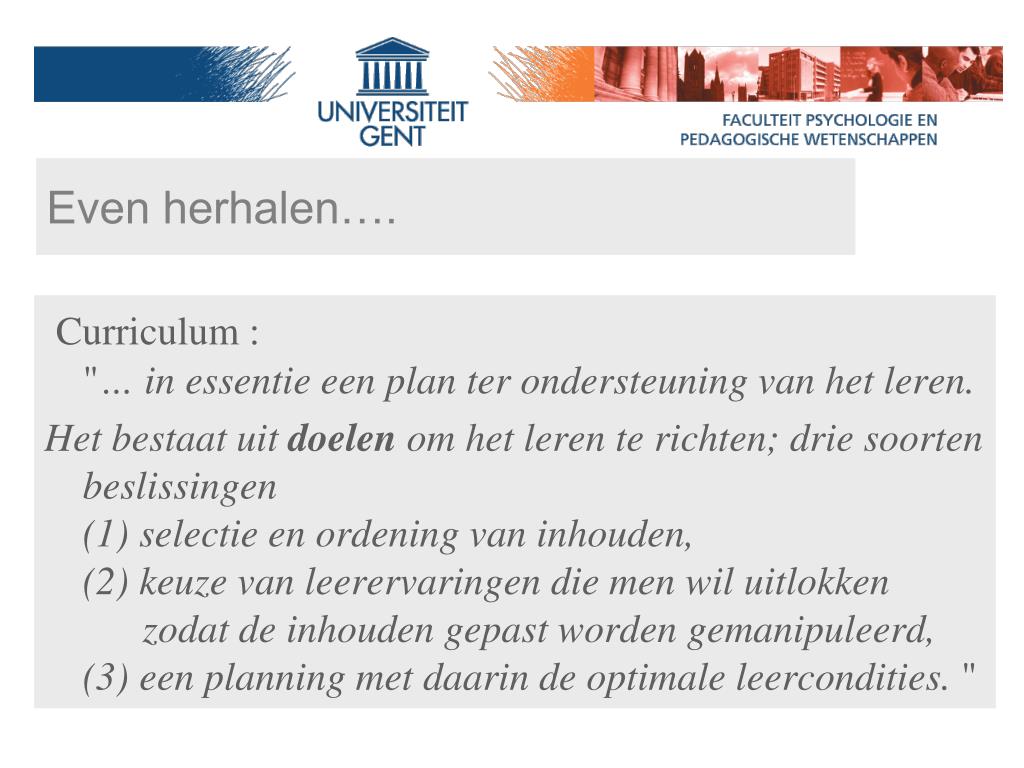 Even herhalen…. Curriculum : "… in essentie een plan ter ondersteuning van het leren. Het bestaat uit doelen om het leren te richten; drie soorten beslissingen (1) selectie en ordening van inhouden, (2) keuze van leerervaringen die men wil uitlokken zodat de inhouden gepast worden gemanipuleerd, (3) een planning met daarin de optimale leercondities. "