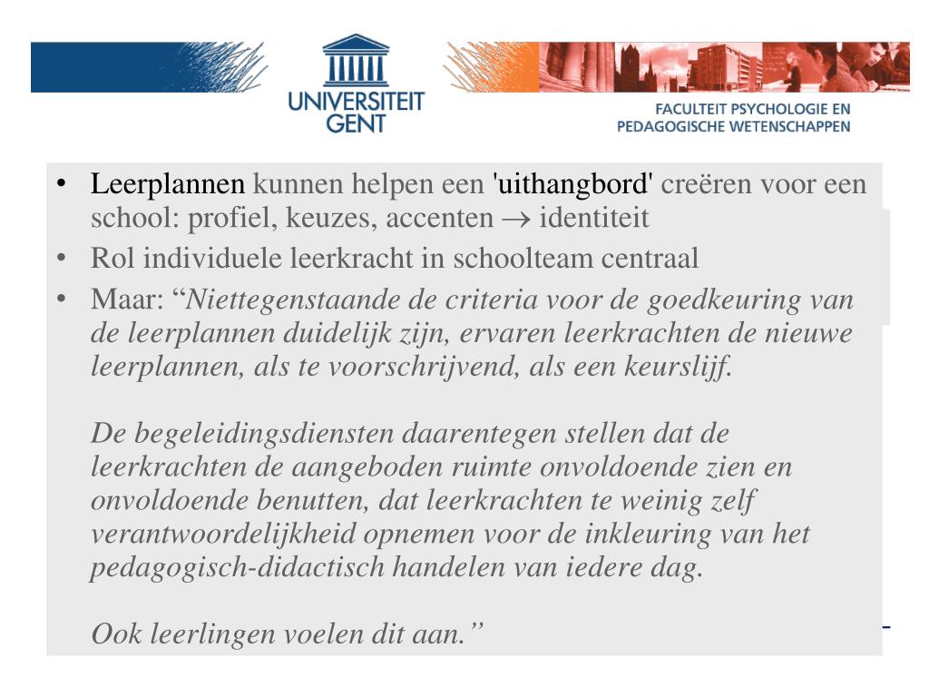 Kansen • Leerplannen kunnen helpen een 'uithangbord' creëren voor een school: profiel, keuzes, accenten identiteit • Rolindividueleleerkracht in schoolteamcentraal • Maar: “Niettegenstaande de criteria voor de goedkeuring van de leerplannen duidelijk zijn, ervaren leerkrachten de nieuwe leerplannen, als te voorschrijvend, als een keurslijf. De begeleidingsdiensten daarentegen stellen dat de leerkrachten de aangeboden ruimte onvoldoende zien en onvoldoende benutten, dat leerkrachten te weinig zelf verantwoordelijkheid opnemen voor de inkleuring van het pedagogisch-didactisch handelen van iedere dag. Ook leerlingen voelen dit aan.”