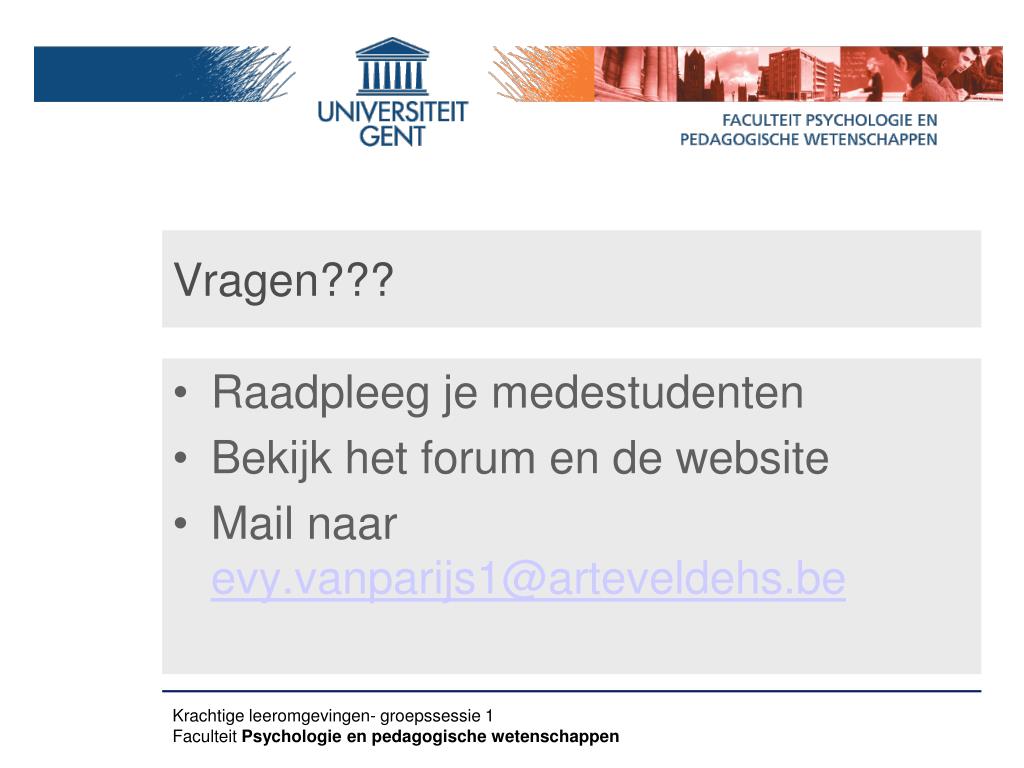 Vragen??? • Raadpleeg je medestudenten • Bekijk het forum en de website • Mail naar evy.vanparijs1@arteveldehs.be Krachtige leeromgevingen- groepssessie 1FaculteitPsychologie en pedagogischewetenschappen