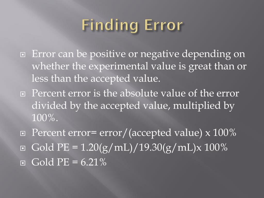 Finding Error • Error is the difference between the experimental value and the accepted value. • Error= experimental value- accepted value • The density of gold is 19.30 g/mL. You do a experiment and find a density for gold of 20.50 g/mL. What is the error in your experiment?