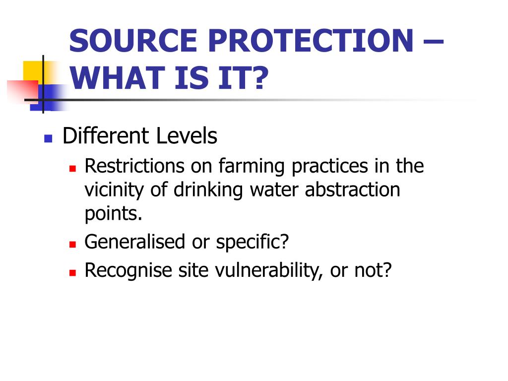 SOURCE PROTECTION – WHAT IS IT? • Different Levels • Restrictions on farming practices in the vicinity of drinking water abstraction points. • Generalised or specific? • Recognise site vulnerability, or not?