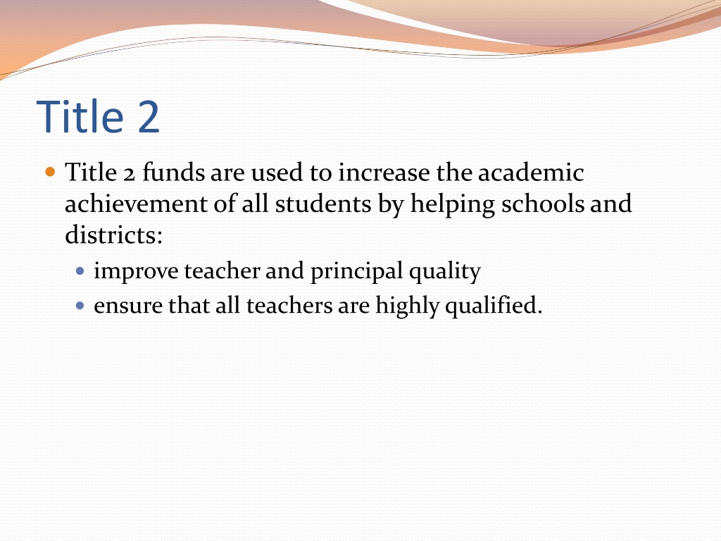 Title 2 • Title 2 funds are used to increase the academic achievement of all students by helping schools and districts: • improve teacher and principal quality • ensure that all teachers are highly qualified.