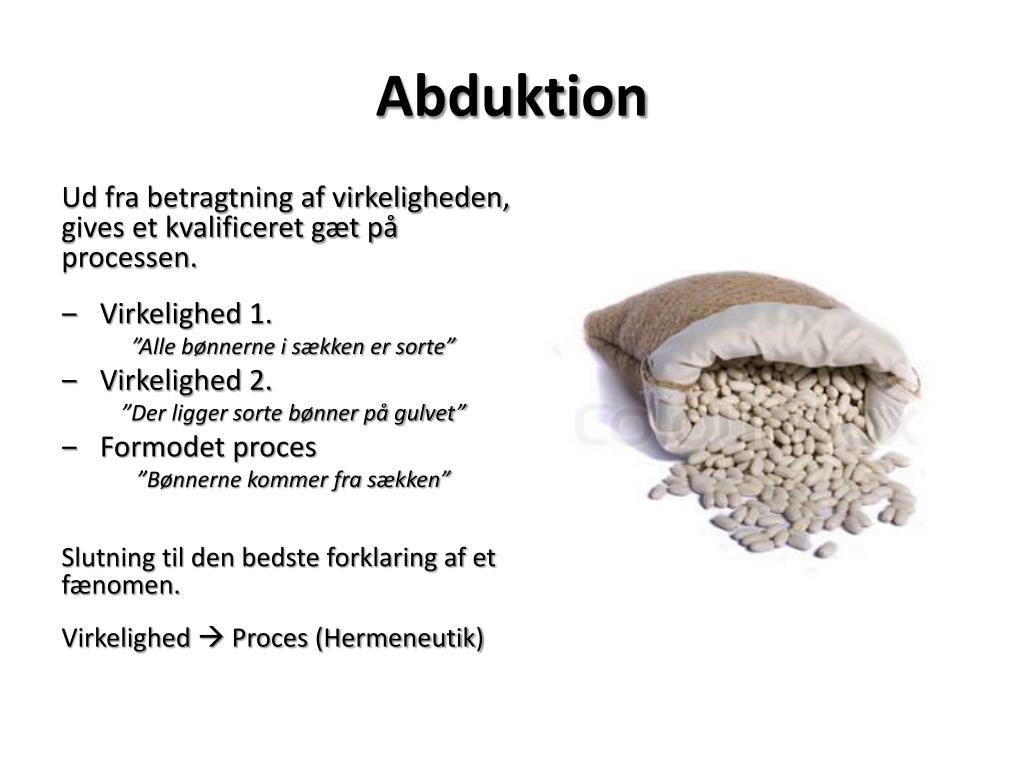 Abduktion Ud fra betragtning af virkeligheden, gives et kvalificeret gæt på processen. • Virkelighed 1. ”Alle bønnerne i sækken er sorte” • Virkelighed 2. ”Der ligger sorte bønner på gulvet” • Formodet proces ”Bønnerne kommer fra sækken” Slutning til den bedste forklaring af et fænomen. Virkelighed Proces (Hermeneutik)