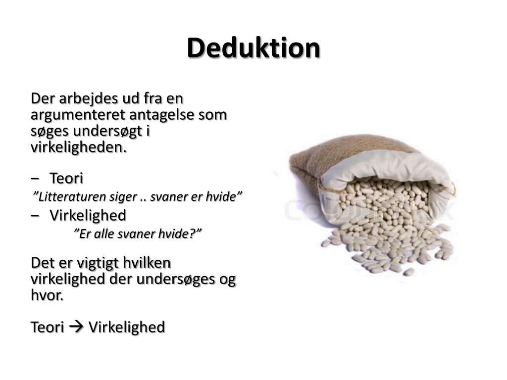 Deduktion Der arbejdes ud fra en argumenteret antagelse som søges undersøgt i virkeligheden. • Teori ”Litteraturen siger .. svaner er hvide” • Virkelighed ”Er alle svaner hvide?” Det er vigtigt hvilken virkelighed der undersøges og hvor. Teori Virkelighed