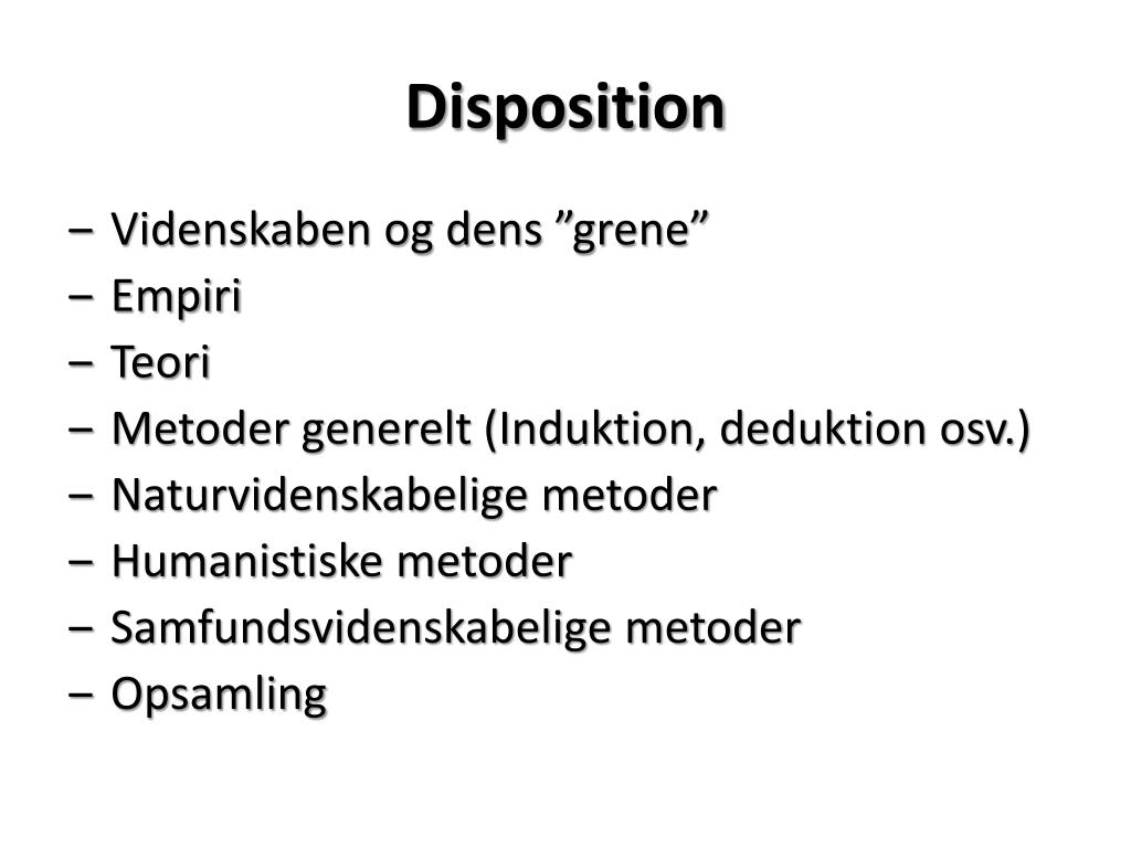 Disposition • Videnskaben og dens ”grene” • Empiri • Teori • Metoder generelt (Induktion, deduktion osv.) • Naturvidenskabelige metoder • Humanistiske metoder • Samfundsvidenskabelige metoder • Opsamling
