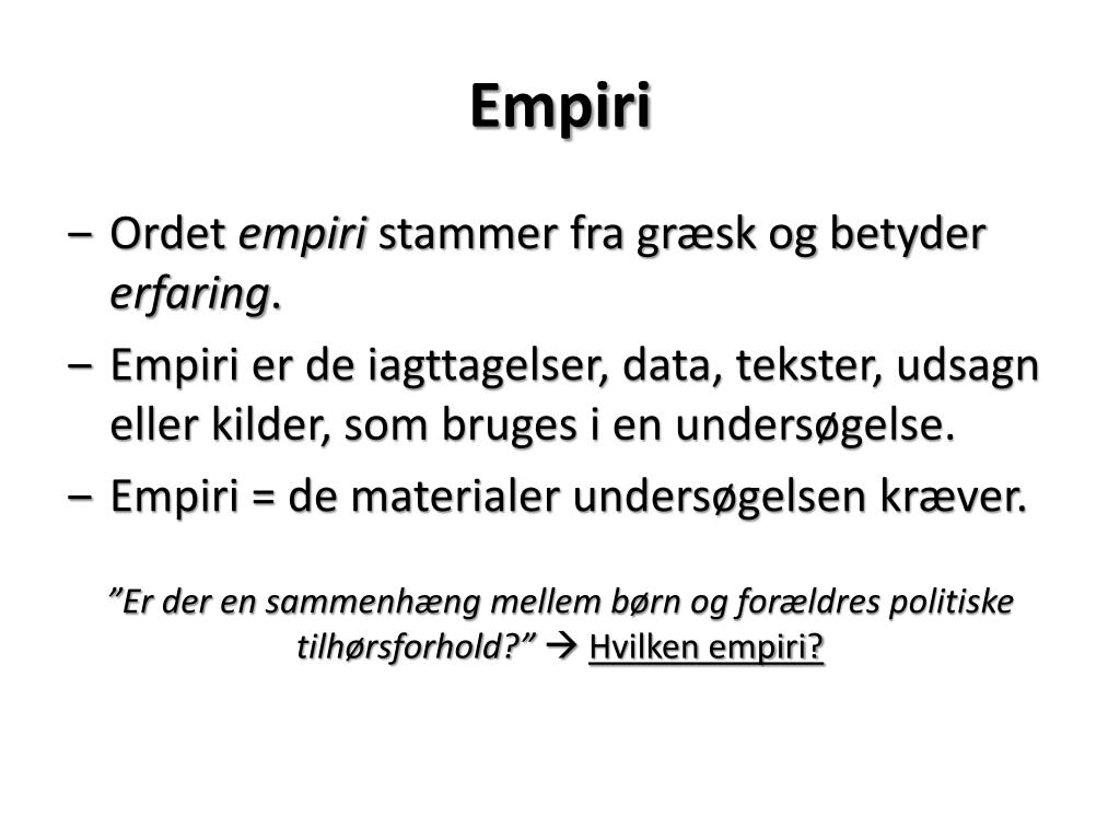 Empiri • Ordet empiri stammer fra græsk og betyder erfaring. • Empiri er de iagttagelser, data, tekster, udsagn eller kilder, som bruges i en undersøgelse. • Empiri = de materialer undersøgelsen kræver. ”Er der en sammenhæng mellem børn og forældres politiske tilhørsforhold?” Hvilken empiri?