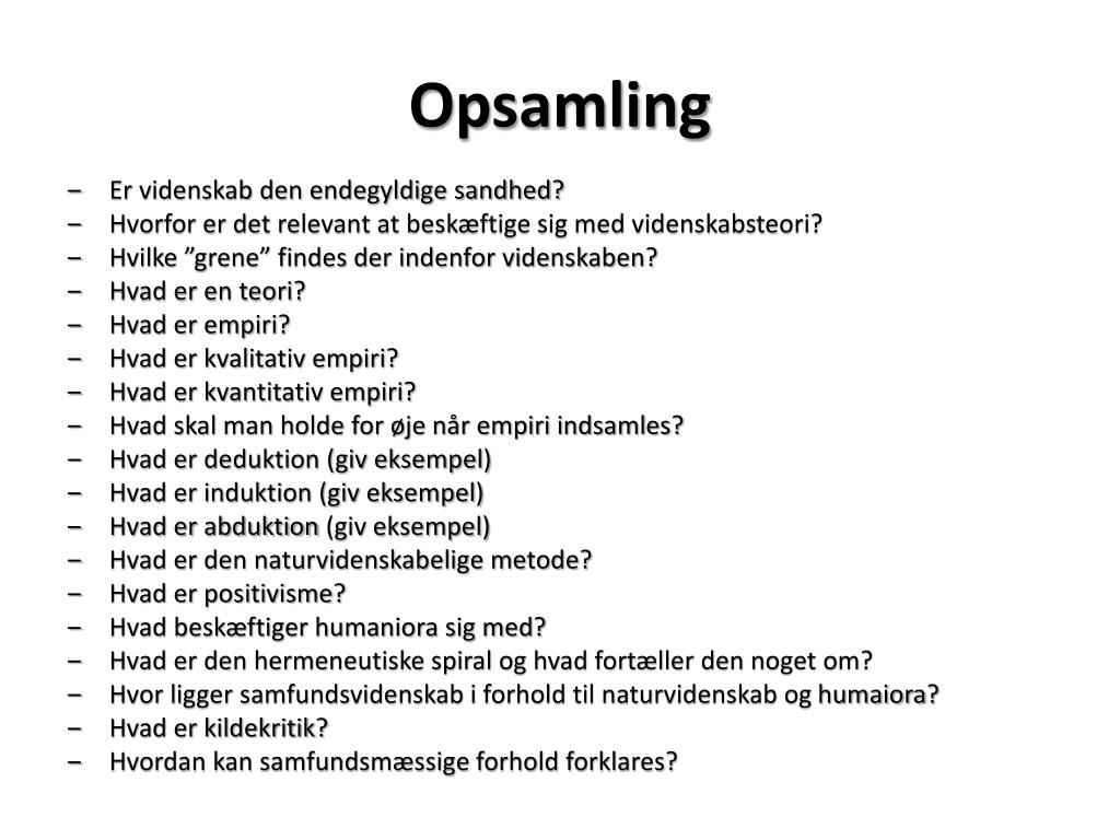 Opsamling • Er videnskab den endegyldige sandhed? • Hvorfor er det relevant at beskæftige sig med videnskabsteori? • Hvilke ”grene” findes der indenfor videnskaben? • Hvad er en teori? • Hvad er empiri? • Hvad er kvalitativ empiri? • Hvad er kvantitativ empiri? • Hvad skal man holde for øje når empiri indsamles? • Hvad er deduktion (giv eksempel) • Hvad er induktion (giv eksempel) • Hvad er abduktion (giv eksempel) • Hvad er den naturvidenskabelige metode? • Hvad er positivisme? • Hvad beskæftiger humaniora sig med? • Hvad er den hermeneutiske spiral og hvad fortæller den noget om? • Hvor ligger samfundsvidenskab i forhold til naturvidenskab og humaiora? • Hvad er kildekritik? • Hvordan kan samfundsmæssige forhold forklares?