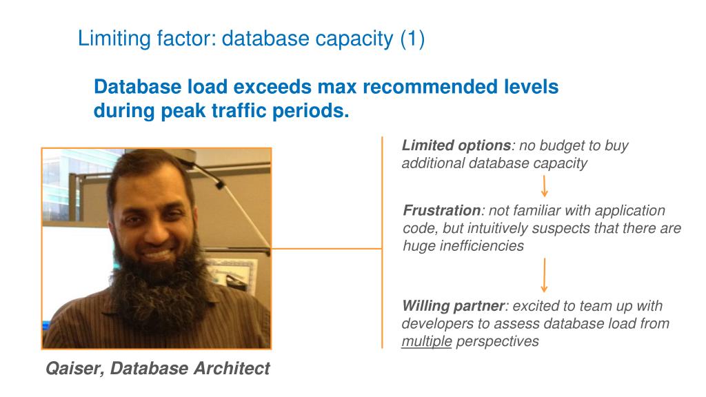 Limiting factor: database capacity (1) Database load exceeds max recommended levels during peak traffic periods. Limited options: no budget to buy additional database capacity Frustration: not familiar with application code, but intuitively suspects that there are huge inefficiencies Willing partner: excited to team up with developers to assess database load from multiple perspectives Qaiser, Database Architect