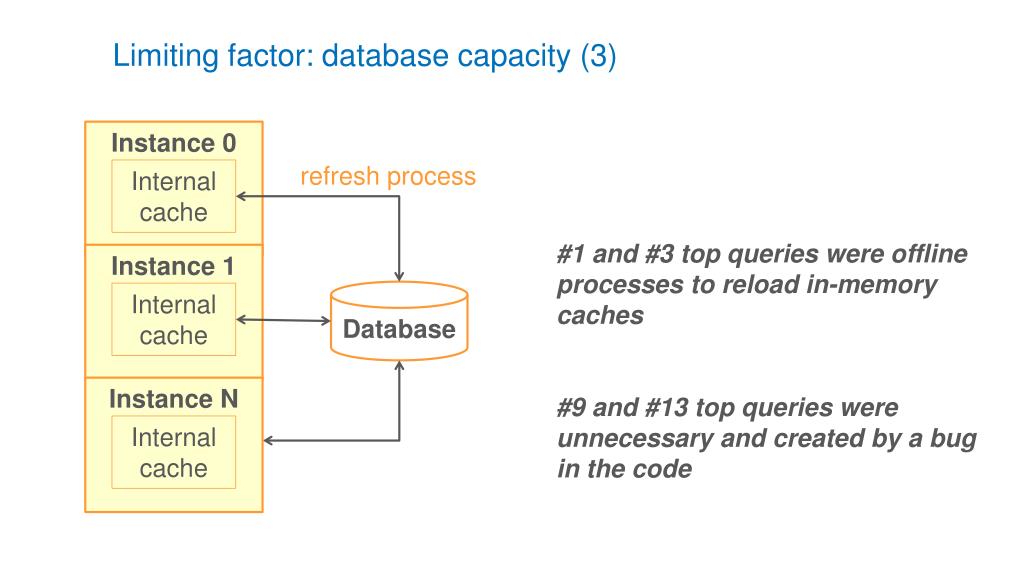 Limiting factor: database capacity (3) Instance 0 refresh process Internal cache #1 and #3 top queries were offline processes to reload in-memory caches #9 and #13 top queries were unnecessary and created by a bug in the code Instance 1 Database Internal cache … Instance N Internal cache