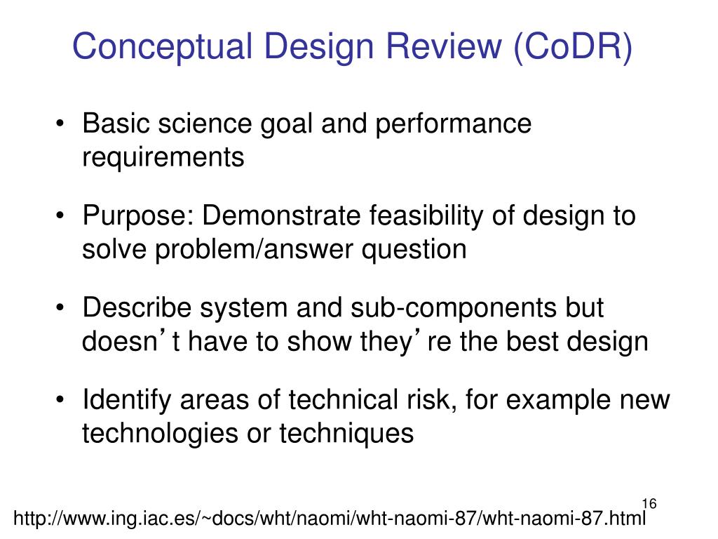 Conceptual Design Review (CoDR) • Basic science goal and performance requirements • Purpose: Demonstrate feasibility of design to solve problem/answer question • Describe system and sub-components but doesn’t have to show they’re the best design • Identify areas of technical risk, for example new technologies or techniques http://www.ing.iac.es/~docs/wht/naomi/wht-naomi-87/wht-naomi-87.html