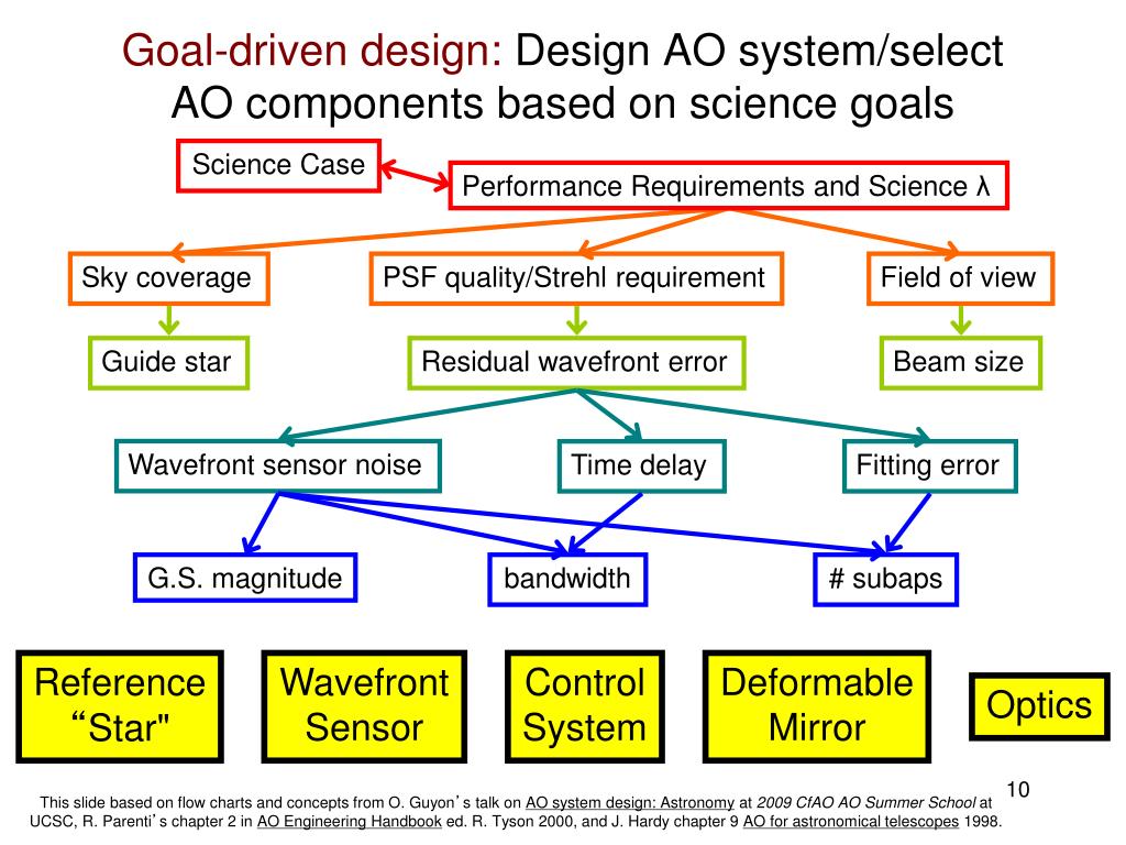 Science Case Performance Requirements and Science λ Sky coverage PSF quality/Strehl requirement Field of view Guide star Residual wavefront error Beam size Wavefront sensor noise Time delay Fitting error G.S. magnitude bandwidth # subaps Reference “Star" Wavefront Sensor Control System Deformable Mirror Optics Goal-driven design: Design AO system/select AO components based on science goals This slide based on flow charts and concepts from O. Guyon’s talk on AO system design: Astronomy at 2009 CfAO AO Summer School at UCSC, R. Parenti’s chapter 2 in AO Engineering Handbook ed. R. Tyson 2000, and J. Hardy chapter 9 AO for astronomical telescopes 1998.