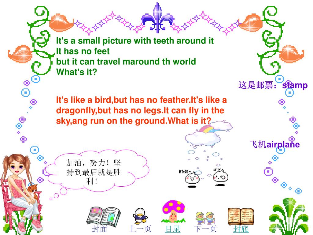 封面 下一页 目录 上一页 封底 It's a small picture with teeth around it It has no feet but it can travel maround th world What's it? 这是邮票:stamp It's like a bird,but has no feather.It's like a dragonfly,but has no legs.It can fly in the sky,ang run on the ground.What is it? 飞机airplane 加油,努力!坚持到最后就是胜利!