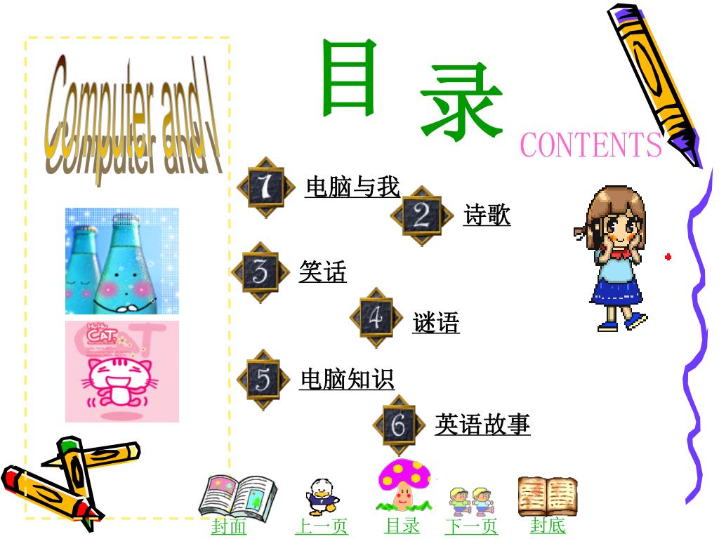 封面 下一页 目录 上一页 封底 目 录 Computer and I CONTENTS 电脑与我 诗歌 笑话 谜语 电脑知识 英语故事