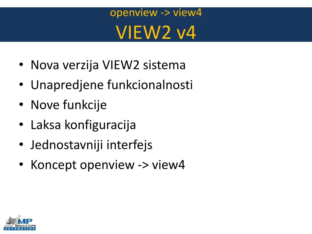 openview -> view4VIEW2 v4 • Nova verzija VIEW2 sistema • Unapredjene funkcionalnosti • Nove funkcije • Laksa konfiguracija • Jednostavniji interfejs • Koncept openview -> view4