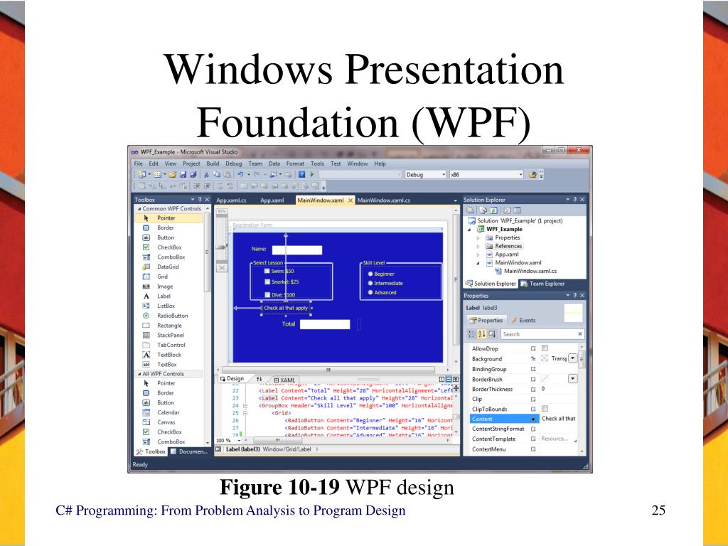 Windows Presentation Foundation • WPF • Interface for Visual Studio 2010 was built using WPF • Vector-based and resolution-independent ->sharp graphics • As with WinForms, drag and drop controls from the Toolbox onto the window C# Programming: From Problem Analysis to Program Design