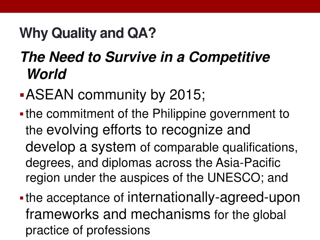 Why Quality and QA? The Need to Survive in a Competitive World • ASEAN community by 2015; • the commitment of the Philippine government to the evolving efforts to recognize and develop a system of comparable qualifications, degrees, and diplomas across the Asia-Pacific region under the auspices of the UNESCO; and • the acceptance of internationally-agreed-upon frameworks and mechanisms for the global practice of professions
