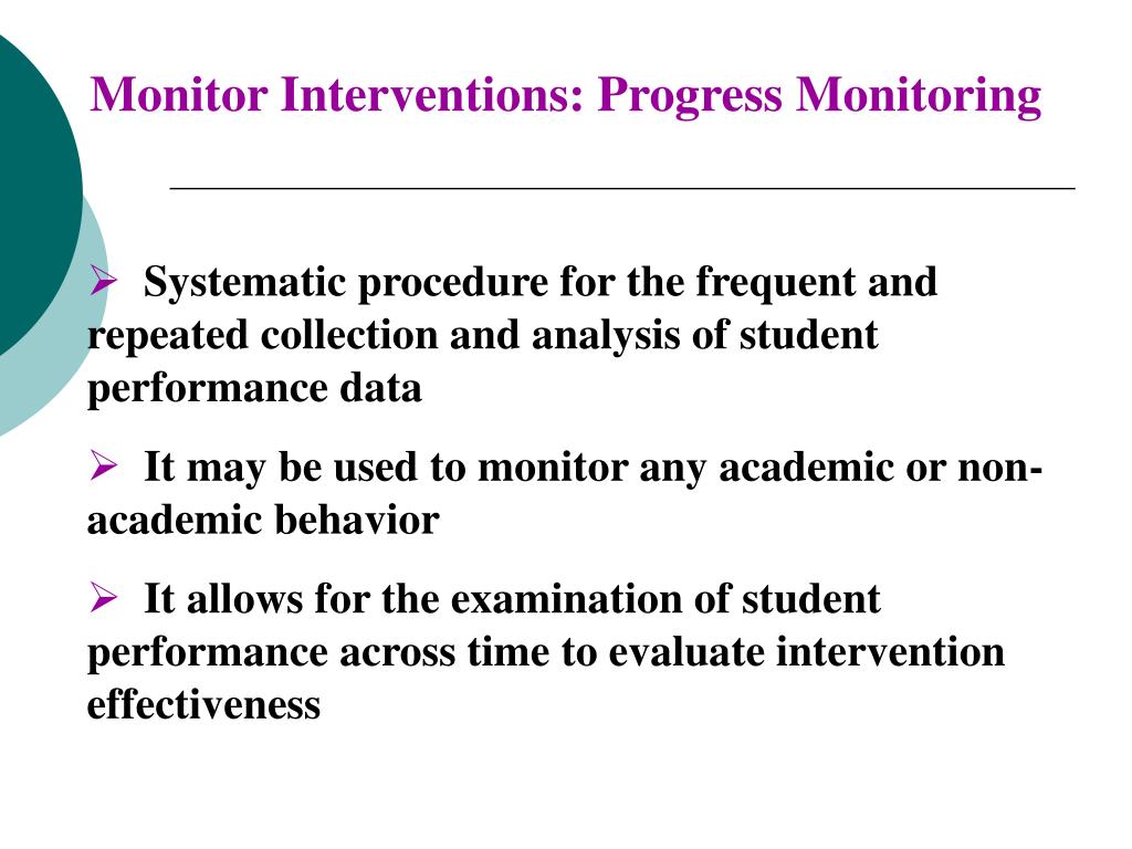 Monitor Interventions: Progress Monitoring • Systematic procedure for the frequent and repeated collection and analysis of student performance data • It may be used to monitor any academic or non-academic behavior • It allows for the examination of student performance across time to evaluate intervention effectiveness