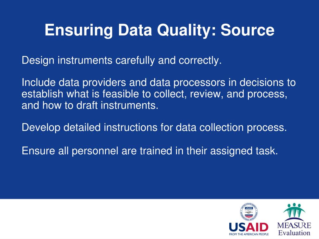 Ensuring Data Quality: Source Design instruments carefully and correctly. Include data providers and data processors in decisions to establish what is feasible to collect, review, and process, and how to draft instruments. Develop detailed instructions for data collection process. Ensure all personnel are trained in their assigned task.