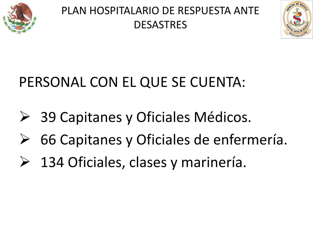 PLAN HOSPITALARIO DE RESPUESTA ANTE DESASTRES • PERSONAL CON EL QUE SE CUENTA: • 39 Capitanes y OficialesMédicos. • 66 Capitanes y Oficiales de enfermería. • 134 Oficiales, clases y marinería.