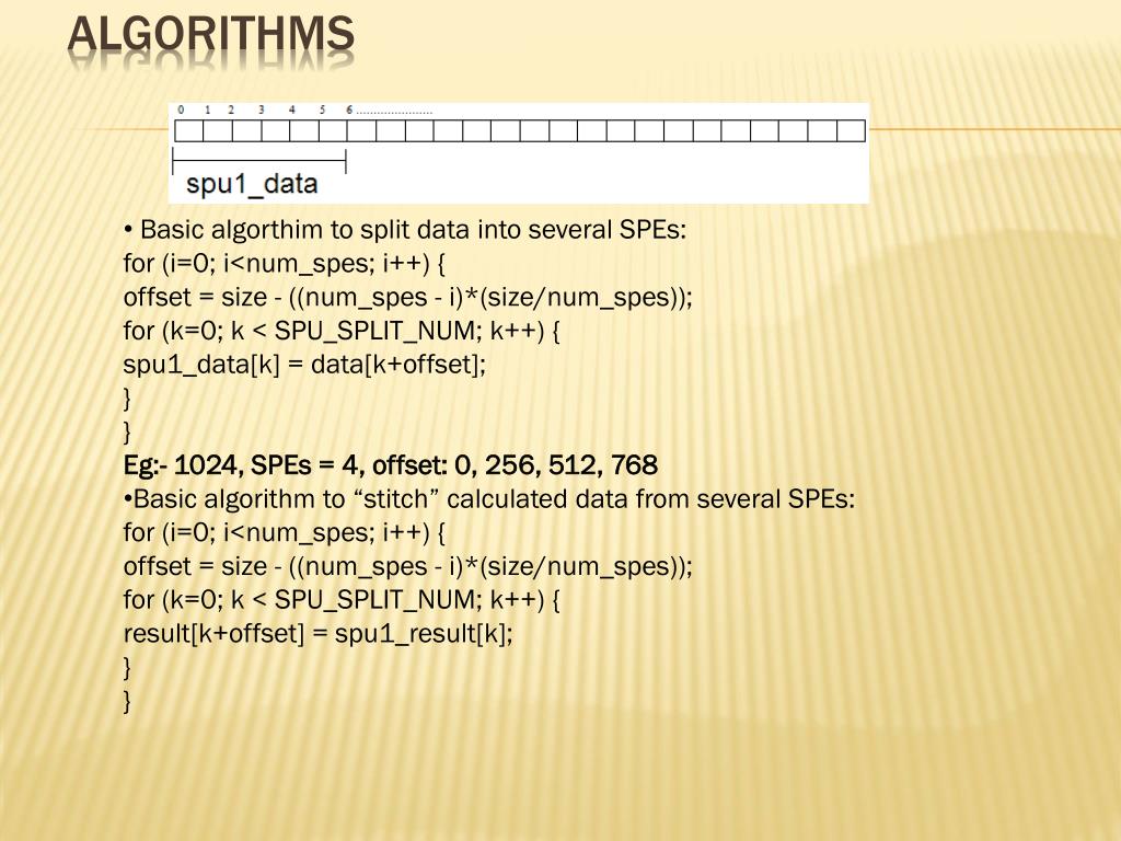 ALGORITHMS • Basic algorthim to split data into several SPEs: • for (i=0; i<num_spes; i++) { • offset = size - ((num_spes - i)*(size/num_spes)); • for (k=0; k < SPU_SPLIT_NUM; k++) { • spu1_data[k] = data[k+offset]; • } • } • Eg:- 1024, SPEs = 4, offset: 0, 256, 512, 768 • Basic algorithm to “stitch” calculated data from several SPEs: • for (i=0; i<num_spes; i++) { • offset = size - ((num_spes - i)*(size/num_spes)); • for (k=0; k < SPU_SPLIT_NUM; k++) { • result[k+offset] = spu1_result[k]; • } • }