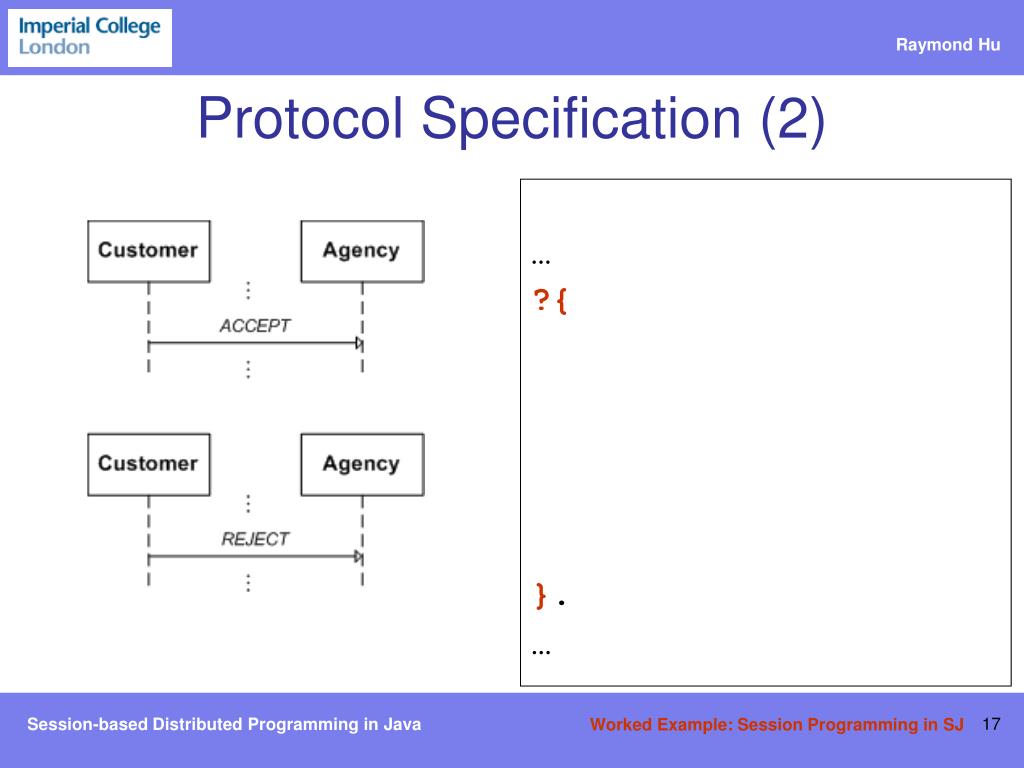 Protocol Specification (2) … ACCEPT: … , REJECT: … ?{ }. … Worked Example: Session Programming in SJ