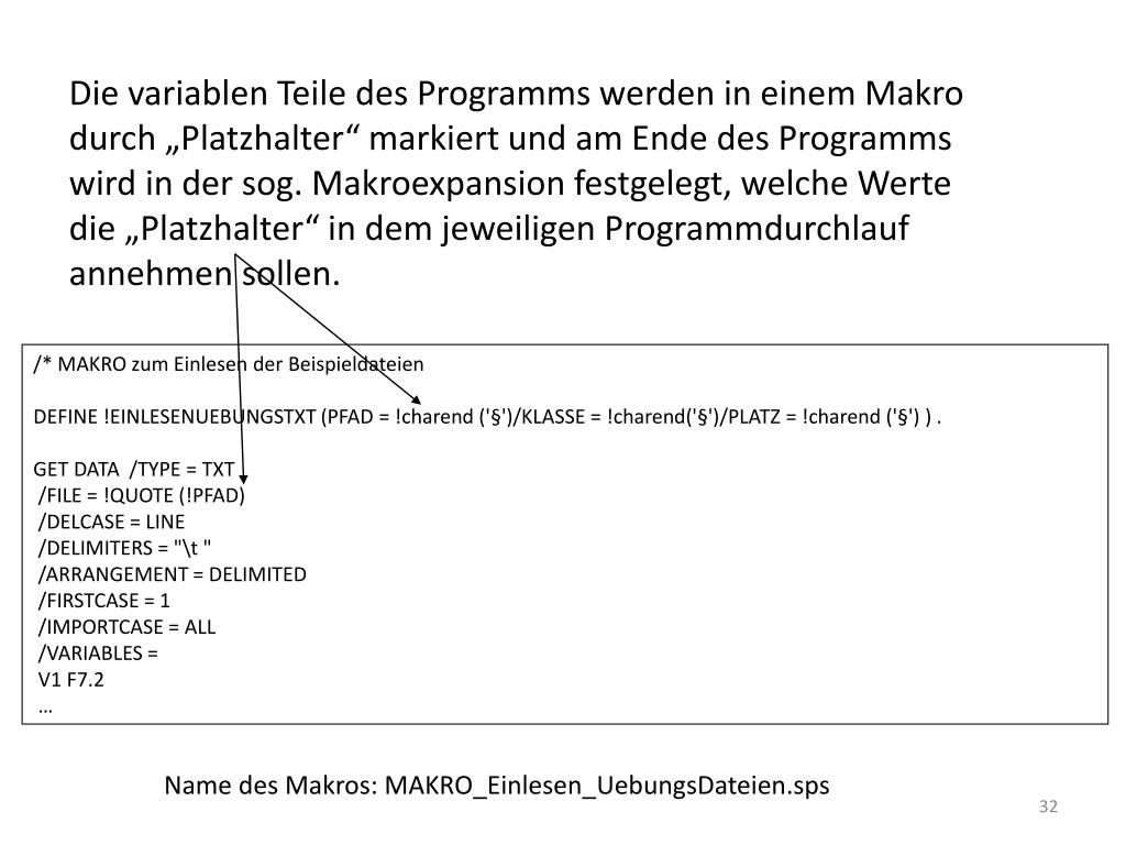 Die variablen Teile des Programms werden in einem Makrodurch „Platzhalter“ markiert und am Ende des Programmswird in der sog. Makroexpansion festgelegt, welche Wertedie „Platzhalter“ in dem jeweiligen Programmdurchlaufannehmen sollen. /* MAKRO zum Einlesen der Beispieldateien DEFINE !EINLESENUEBUNGSTXT (PFAD = !charend ('§')/KLASSE = !charend('§')/PLATZ = !charend ('§') ) . GET DATA /TYPE = TXT /FILE = !QUOTE (!PFAD) /DELCASE = LINE /DELIMITERS = "\t " /ARRANGEMENT = DELIMITED /FIRSTCASE = 1 /IMPORTCASE = ALL /VARIABLES = V1 F7.2 … Name des Makros: MAKRO_Einlesen_UebungsDateien.sps