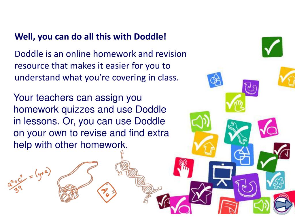 Take control of your learning: …do homework that is packed with exciting animations and interactive activities! …do your homework wherever, whenever – even if you haven’t got your textbooks with you! …do your homework on the computer instead of on paper! With Doddle you can… …access homework that will explain any question you miss! …know how well you did as soon as you finish your homework and have a way to improve your score! …know what homework to do and when!