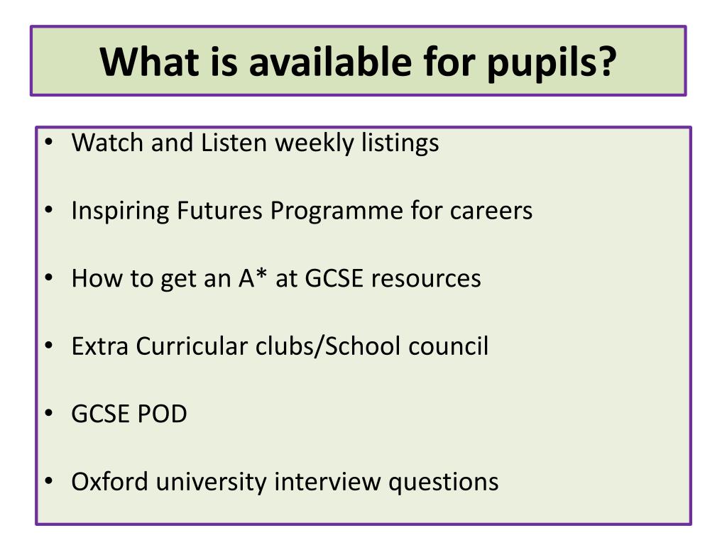 What is available for pupils? • Watch and Listen weekly listings • Inspiring Futures Programme for careers • How to get an A* at GCSE resources • Extra Curricular clubs/School council • GCSE POD • Oxford university interview questions