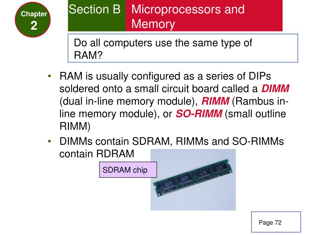 Section B Chapter 2 Microprocessors and Memory Do all computers use the same type of RAM? • RAM is usually configured as a series of DIPs soldered onto a small circuit board called a DIMM (dual in-line memory module), RIMM (Rambus in-line memory module), or SO-RIMM (small outline RIMM) • DIMMs contain SDRAM, RIMMs and SO-RIMMs contain RDRAM SDRAM chip Page 72