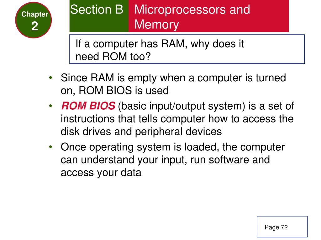 Section B Chapter 2 Microprocessors and Memory If a computer has RAM, why does it need ROM too? • Since RAM is empty when a computer is turned on, ROM BIOS is used • ROM BIOS(basic input/output system) is a set of instructions that tells computer how to access the disk drives and peripheral devices • Once operating system is loaded, the computer can understand your input, run software and access your data Page 72