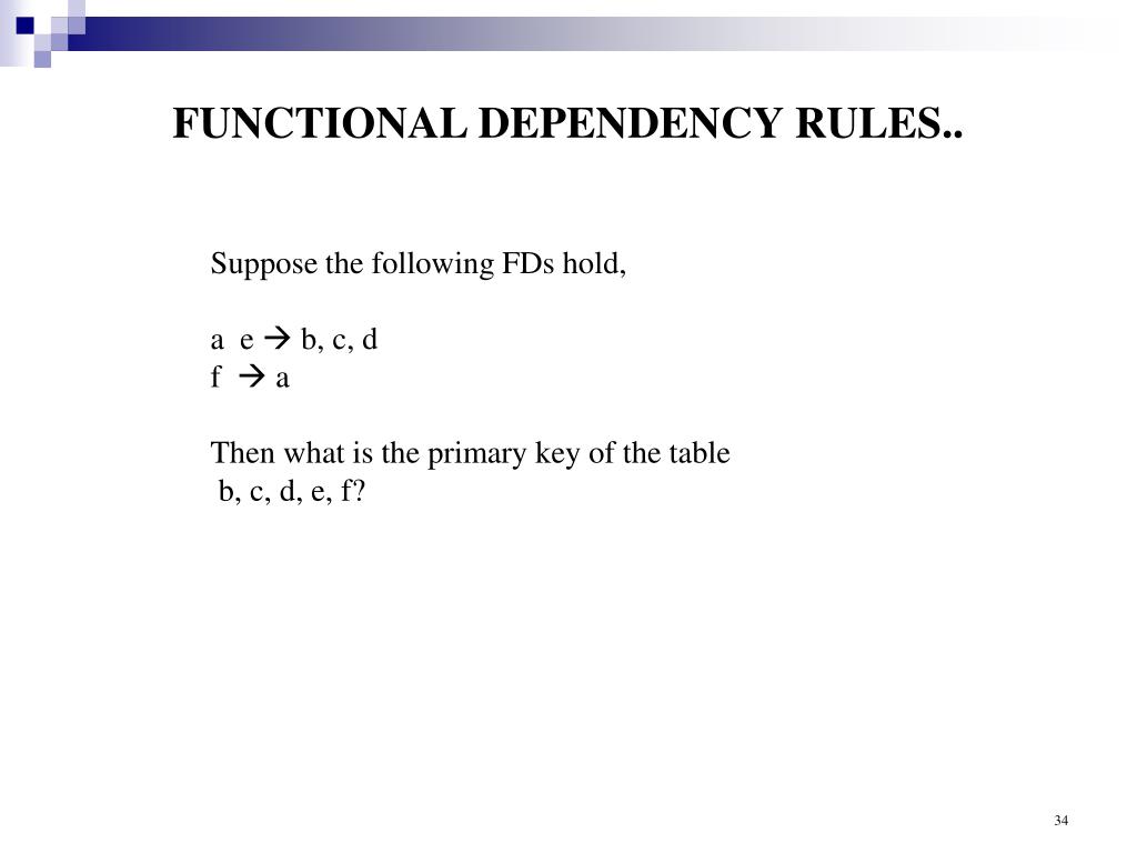 FUNCTIONAL DEPENDENCY RULES 1. Reflexive rule x -- > y e.g. ISBN# --> ISBN# 2. Union rule If x -> y and x --> z then x--> yz e.g. ISBN# --> title and ISBN# --> price then ISBN# --> title, price 3. Transitivity rule If x--> y and y --> z then x--> z e.g. if VIN --> Model and Model --> Engine size then VIN --> Engine size;