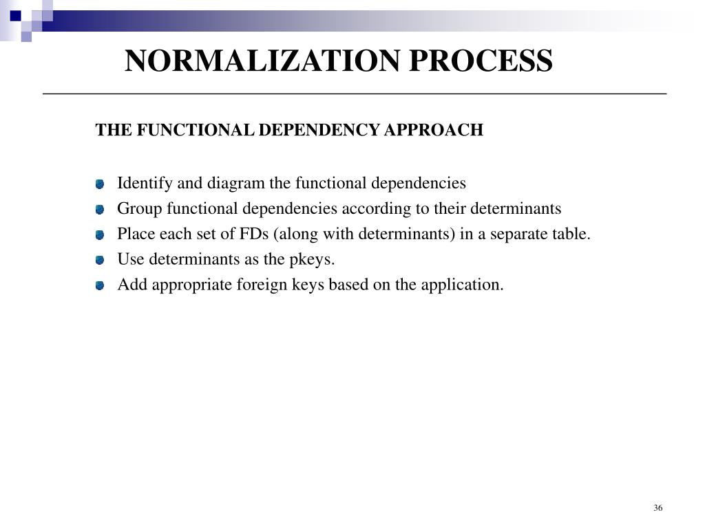 NORMALIZATION PROCESS THE FUNCTIONAL DEPENDENCY APPROACH • Identify and diagram the functional dependencies • Group functional dependencies according to their determinants • Place each set of FDs (along with determinants) in a separate table. • Use determinants as the pkeys. • Add appropriate foreign keys based on the application.