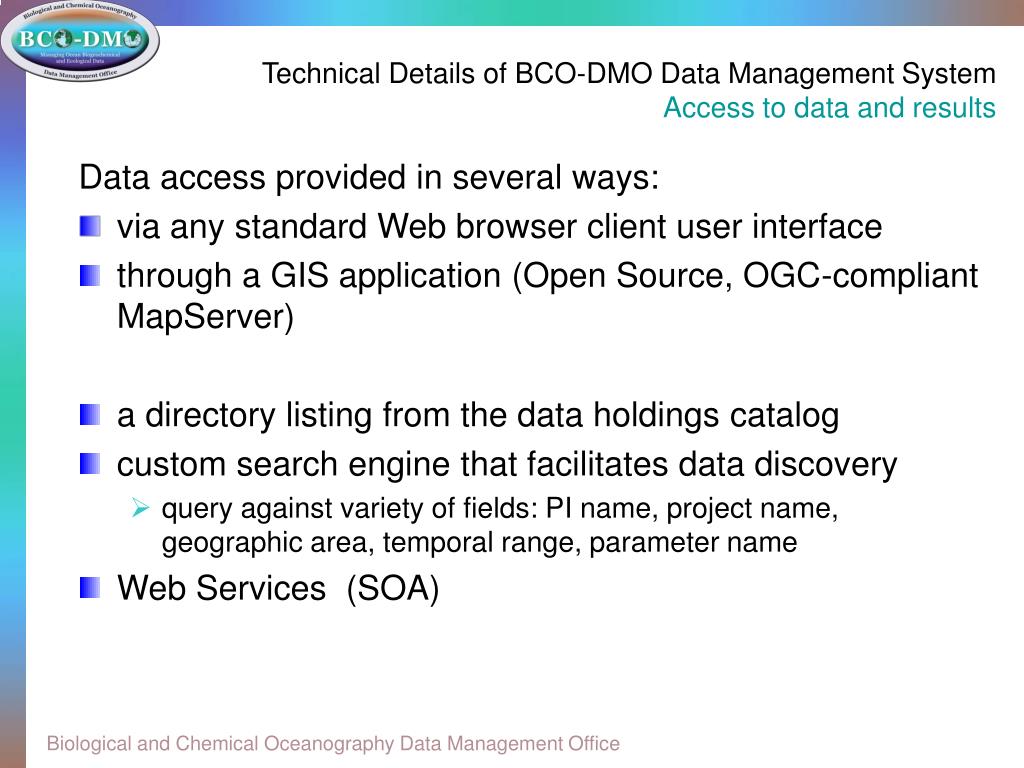 Technical Details of BCO-DMO Data Management SystemAccess to data and results Data access provided in several ways: • via any standard Web browser client user interface • through a GIS application (Open Source, OGC-compliant MapServer) • a directory listing from the data holdings catalog • custom search engine that facilitates data discovery • query against variety of fields: PI name, project name, geographic area, temporal range, parameter name • Web Services (SOA) 20 of 13