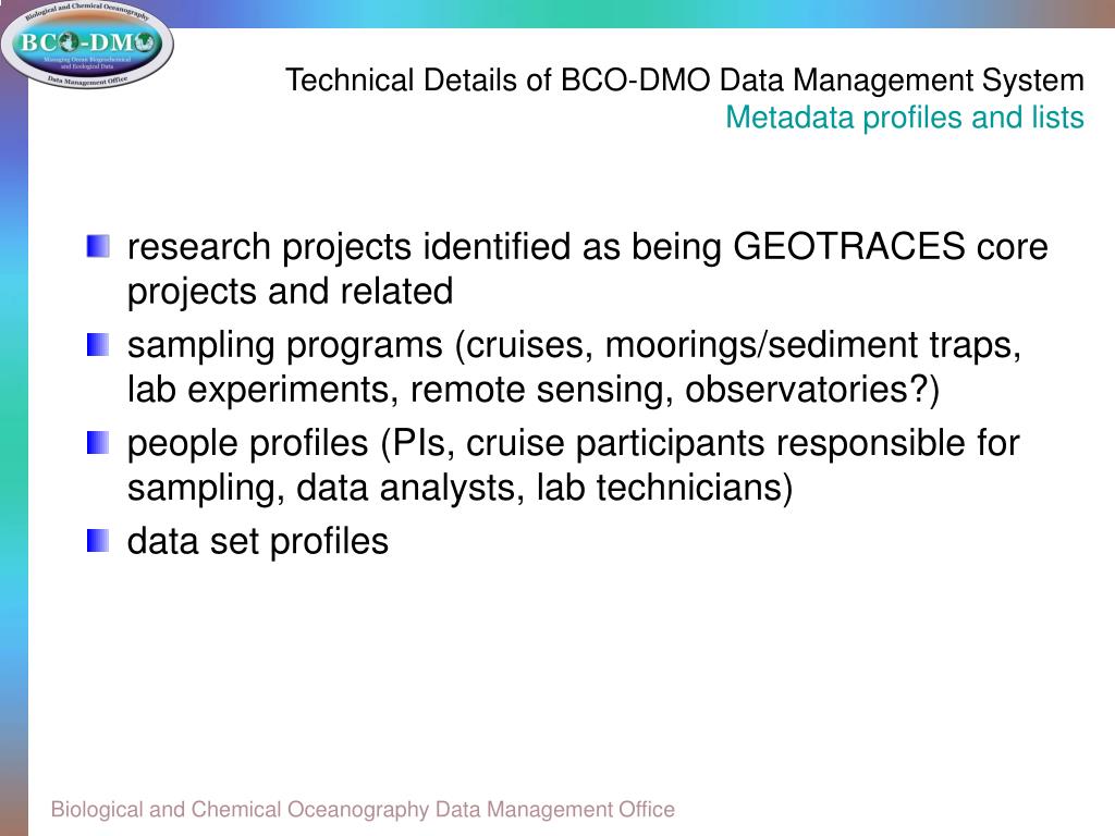 Technical Details of BCO-DMO Data Management SystemMetadata profiles and lists • research projects identified as being GEOTRACES core projects and related • sampling programs (cruises, moorings/sediment traps, lab experiments, remote sensing, observatories?) • people profiles (PIs, cruise participants responsible for sampling, data analysts, lab technicians) • data set profiles 18 of 13