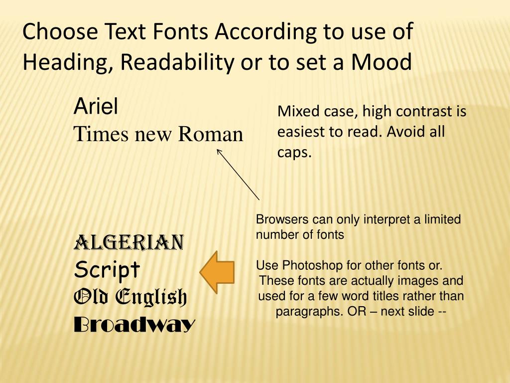 Choose Text Fonts According to use of Heading, Readability or to set a Mood Ariel Times new Roman Algerian Script Old English Broadway Mixed case, high contrast is easiest to read. Avoid all caps. Browsers can only interpret a limited number of fonts Use Photoshop for other fonts or. These fonts are actually images and used for a few word titles rather than paragraphs. OR – next slide --