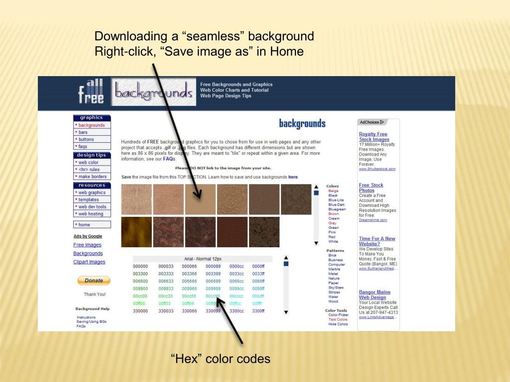 Downloading a “seamless” background Right-click, “Save image as” in Home “Hex” color codes