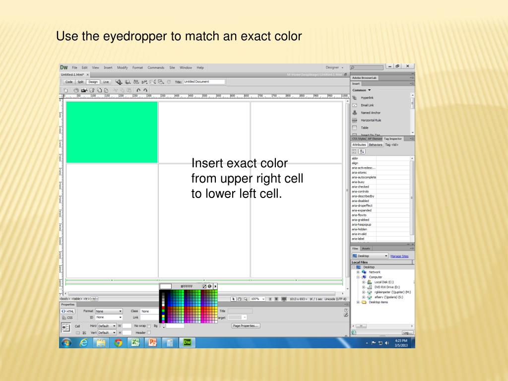 Use the eyedropper to match an exact color Insert exact color from upper right cell to lower left cell.