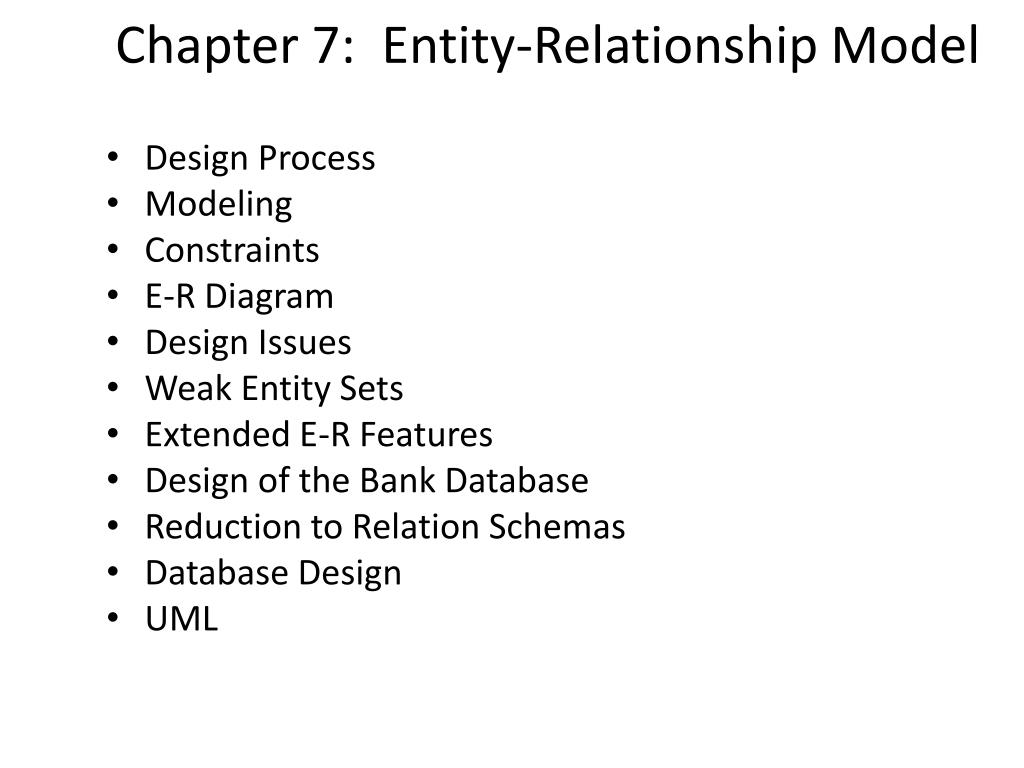 Chapter 7: Entity-Relationship Model • Design Process • Modeling • Constraints • E-R Diagram • Design Issues • Weak Entity Sets • Extended E-R Features • Design of the Bank Database • Reduction to Relation Schemas • Database Design • UML