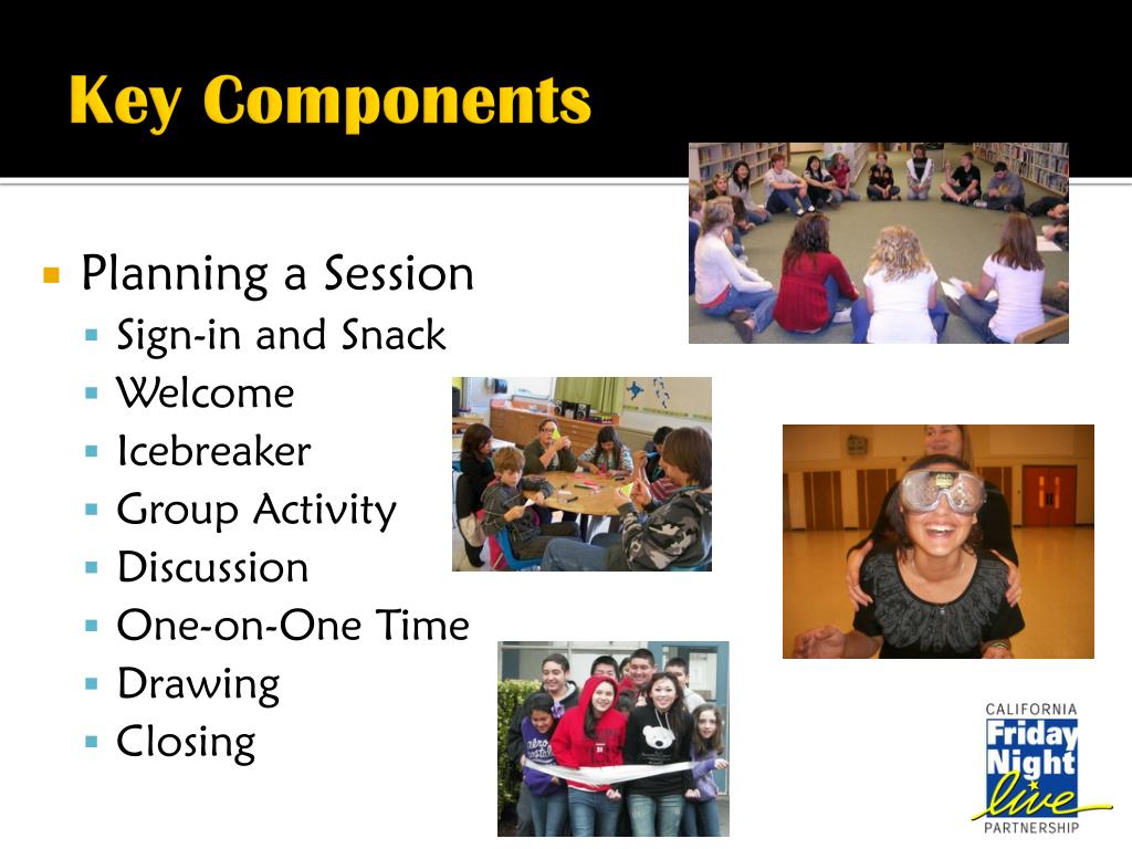 Key Components • Curriculums • FNL Supplemental Lessons • Energizers/Icebreakers • Funding Supported Curriculum