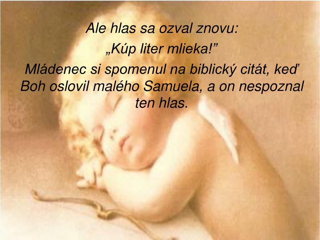 Ale hlas sa ozval znovu: „Kúp liter mlieka!” Mládenec si spomenul na biblický citát, keď Boh oslovil malého Samuela, a on nespoznal ten hlas.
