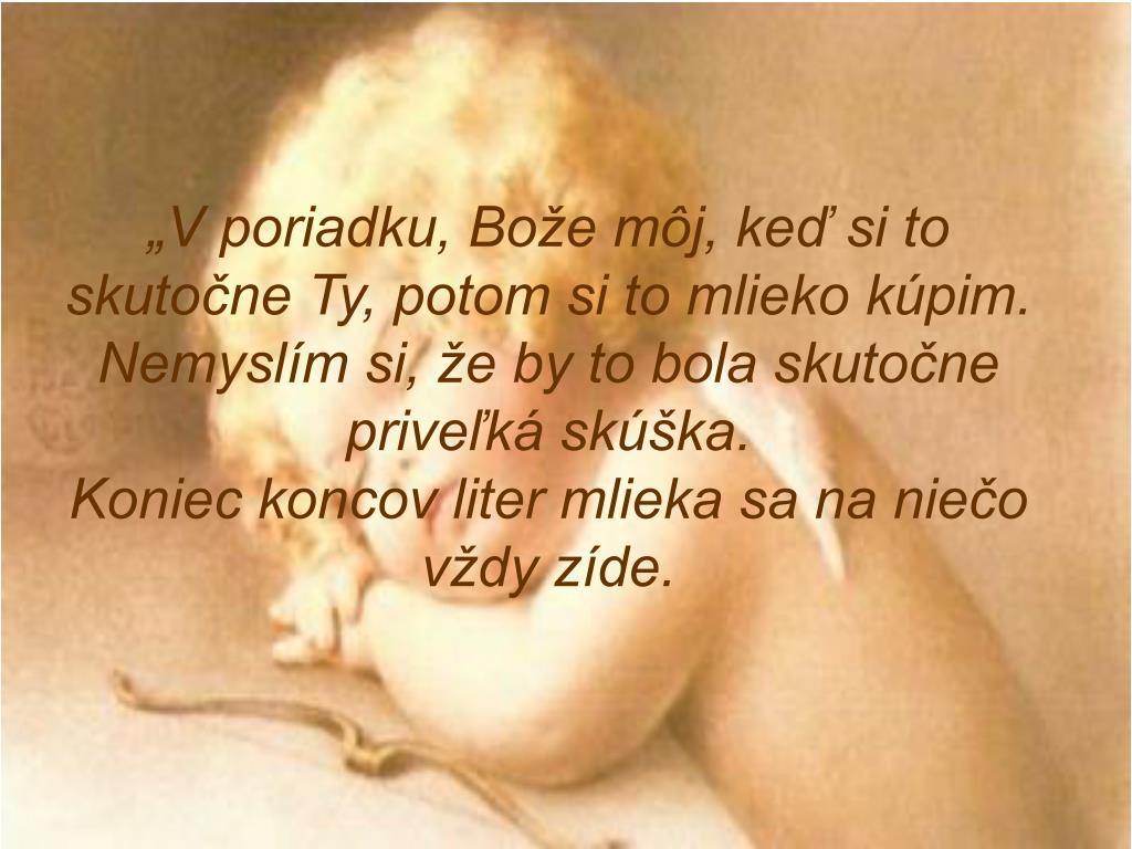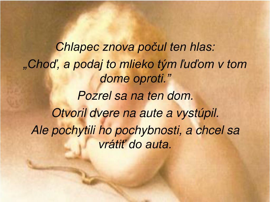 „Prosil som Pána, aby mi ukázal, ako by som mohol zohnať mlieko pre malého.” A aj manželka zavolala z kuchyne: „Ja som prosila Boha, aby poslal anjela....” „Vy ste anjel?”