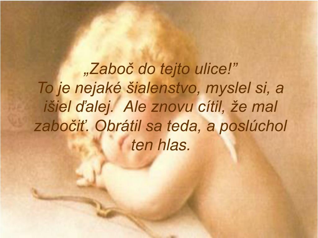„Zaboč do tejto ulice!” To je nejaké šialenstvo, myslel si, a išiel ďalej. Ale znovu cítil, že mal zabočiť. Obrátil sa teda, a poslúchol ten hlas.