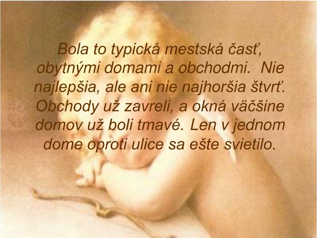 Bola to typická mestská časť, obytnými domami a obchodmi. Nie najlepšia, ale ani nie najhoršia štvrť.Obchody už zavreli, a okná väčšine domov už boli tmavé.Len v jednom dome oproti ulice sa ešte svietilo.