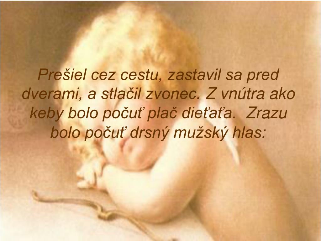 Prešiel cez cestu, zastavil sa pred dverami, a stlačil zvonec.Z vnútra ako keby bolo počuť plač dieťaťa. Zrazu bolo počuť drsný mužský hlas: