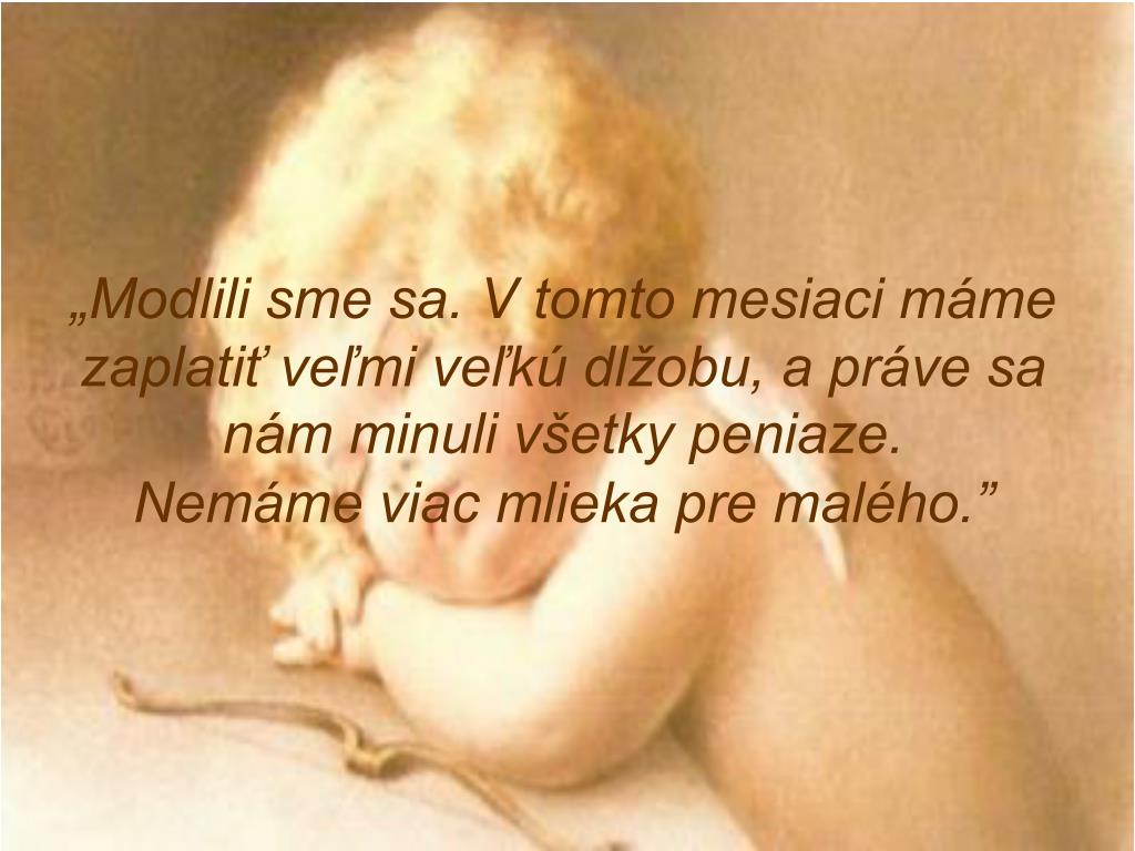 „Modlili sme sa. V tomto mesiaci máme zaplatiť veľmi veľkú dlžobu, a práve sa nám minuli všetky peniaze. Nemáme viac mlieka pre malého.”